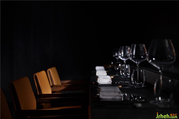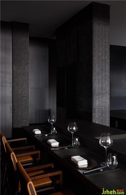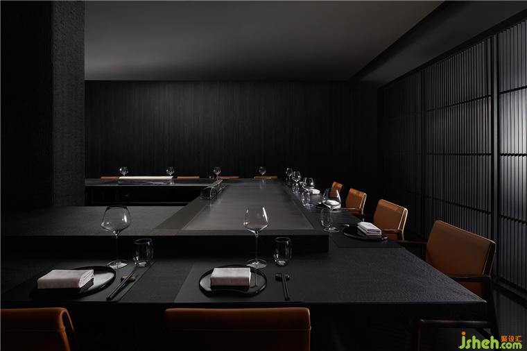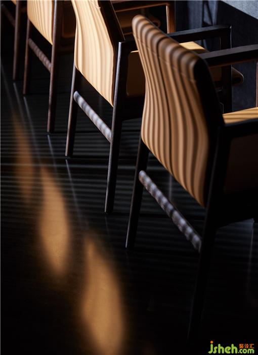 整个就餐区色调统一,间或些许跳色,木质、石材、金属、皮革等相互碰撞,近可感受肌理质感,远能一览结构轮廓,铁板烧餐厅设计在光线和视角的转换之下,意味深长。