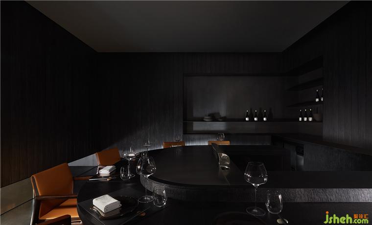 铁板烧餐厅设计本身定位为高端预约制,基于场地、功能与客群分析,我们拒绝过多的元素堆砌,放弃刻意的故事营造,试图传达一种沉浸式的餐饮氛围。透过暗黑色调的铺陈,加强对宾客心理的引导,在不断的深入中产生回响,无形中凝聚出一种力量,可以打动自己,打动宾客,打动观者。