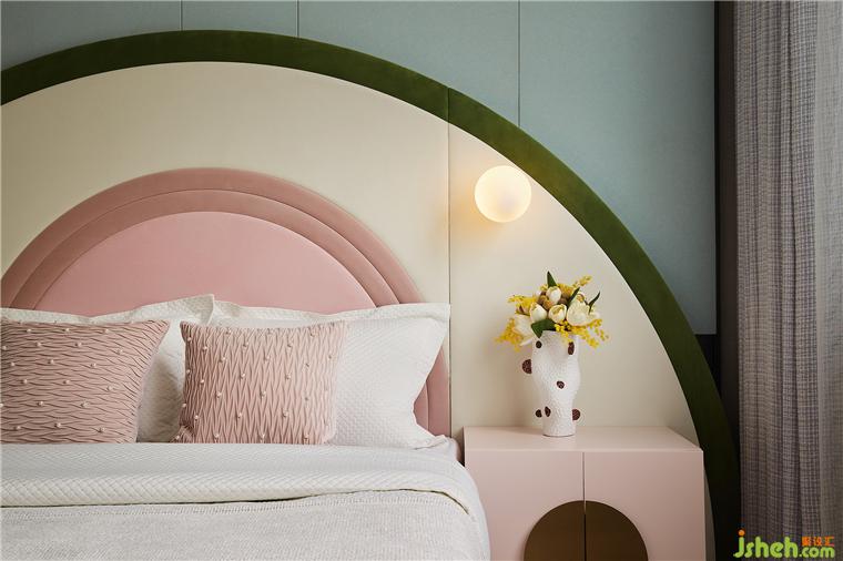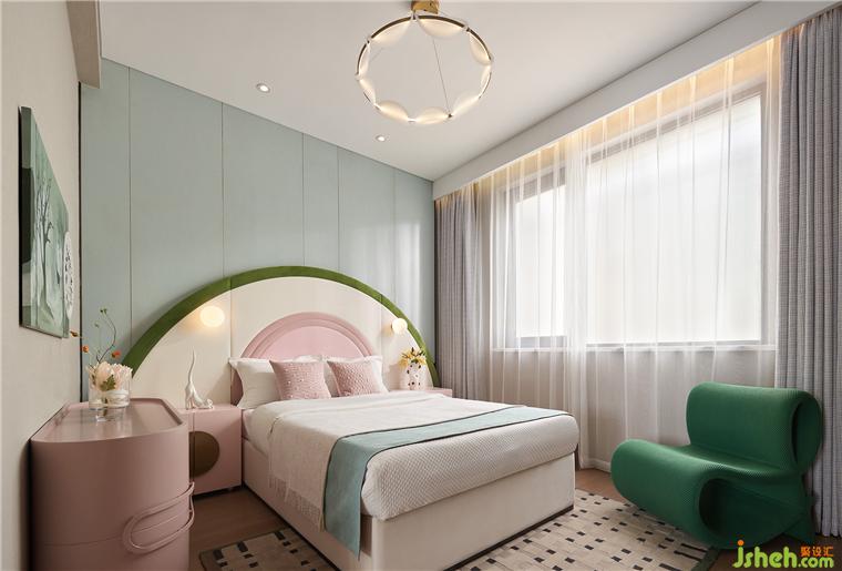 以童趣视角作为情感链接,儿童房巧用马卡龙色系,细腻的粉、生机的绿、样板间设计以及柔和的蓝,配合灵动的造型,以此进一步引导多元感知。