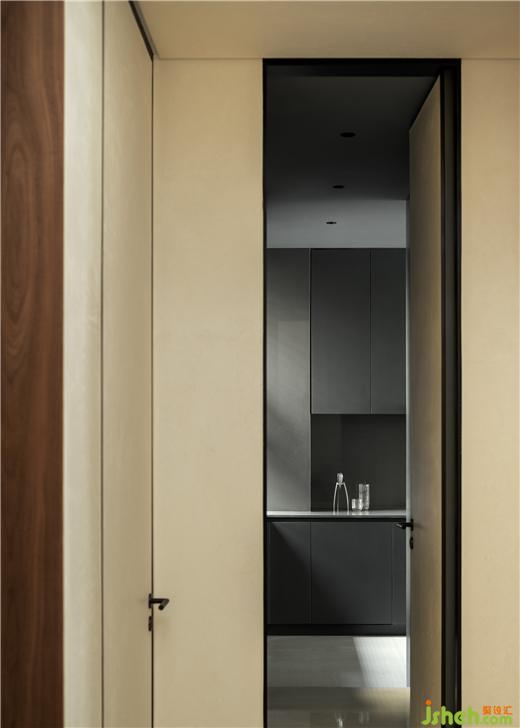 体贴周全的设计也离不开对厨房内外部的关系梳理。叠墅设计有效扩大原始厨房尺度,并增设双通道步入模式,打开与公共区域的联动。于内合理排布,提升实用效率,在暗黑静谧的调性里,无声流淌卓越质感。