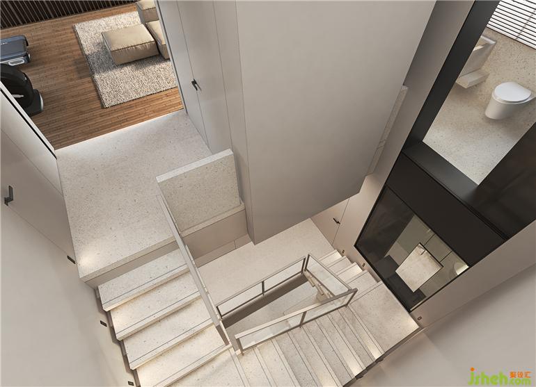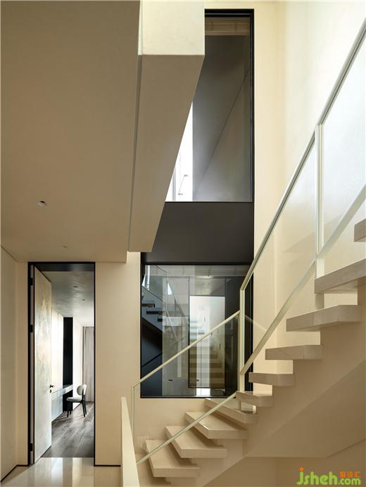楼梯间从一层到三层纵向打通,套景手法也同步贯彻。两个独立的空间彼此延伸,规整和谐。三层则略显外凸,交错的体块与严谨的配比,进一步彰显着细腻的处理。