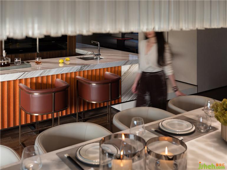 汲取设计元素的延续,强化整体感受。拼叠有序、内凹成势、弧度起伏之貌同样出现在吧台,底座则运用金属构件又可削弱体量厚重感,对立与融合的张力亦潜藏于细部之中。
