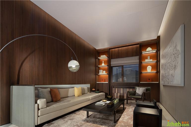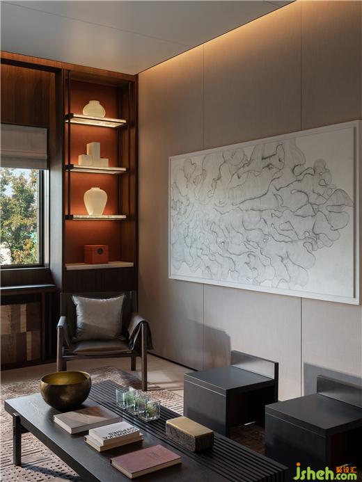 参照酒店式起居场景,于二楼构造枢纽之地,套间居室环绕。常州天安别墅设计提取颇具东方意象的屏风形态,对沙发呈包裹姿态,并以此开启围合布局。内敛规整的低调秩序亦进一步描摹酒店气韵,透过阵列式陈设、高饱和色点缀,强化典雅之境。在深浅对比、错落有致中,仪式感与随性气息兼具。