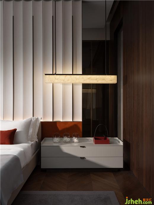 酒店式居住感受,切实落笔在体验层面,主卧套间可谓对此深度践行。常州天安别墅设计主背景显著的线条韵律、内凹的弧度极具包容抚慰之感,清晰可见其与一楼一脉相承之意。非对称的床头柜设计,也蕴含着对上下体量、前后交互的思考。搭配两侧留白,提升感官的从容呼吸。