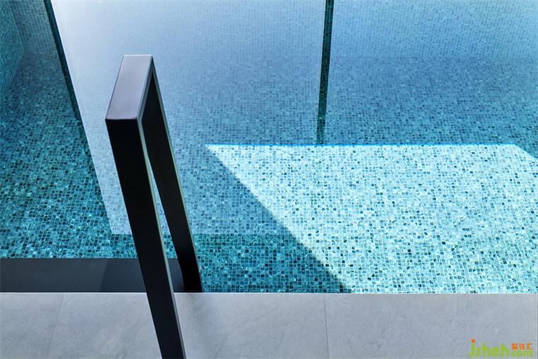 泳池随阳台顺延而出,恰如精致的璞玉,深灰色马赛克的独特纹理,静谧的倒影,度假居所设计让宁静和清凉沁人心脾。碧绿的蓝天连接着透亮的水波,私家独享畅游其中,无比自由惬意。