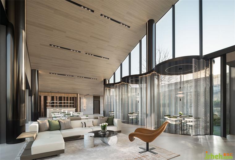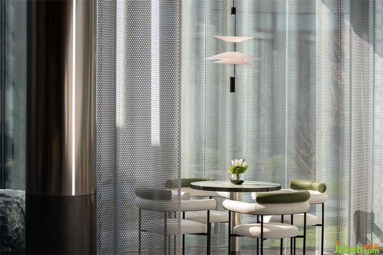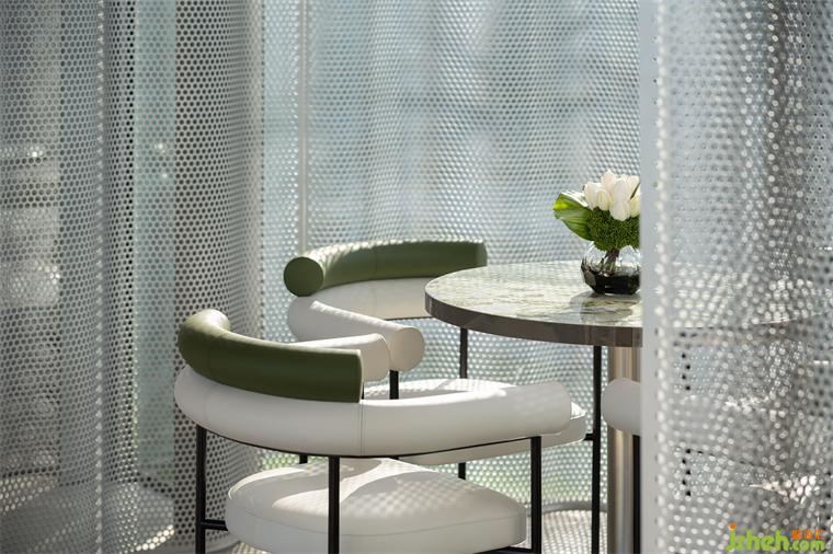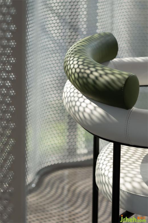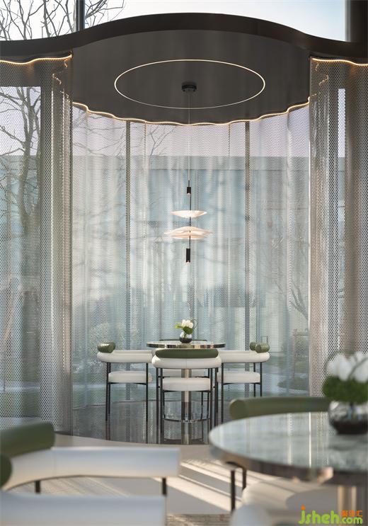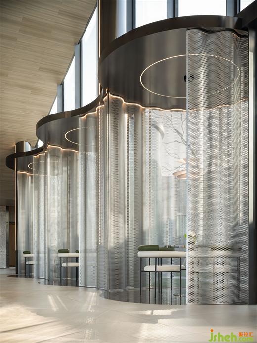 内外共生,无界交融。玻璃幕墙将光与景观引入室内,面向中庭的半圆弧卡座也仿佛置身自然之中,建筑、景观与室内浑然相融,包裹感和私密性也被有效呵护与满足。上海展示中心设计光影婆娑间,捕捉生活的点滴诗意。