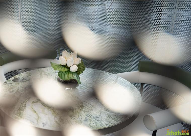 建筑实墙与整片落地门窗的衔接与整合也是设计师的思考要点。3款木纹铝板铺设于立面及顶面,上海展示中心设计精细设置其尺度与拼接方式,在规整排列中塑造出些许渐变与跳脱形态。通透生态的样貌同样延续至洽谈区,让交流更显惬意与随性。