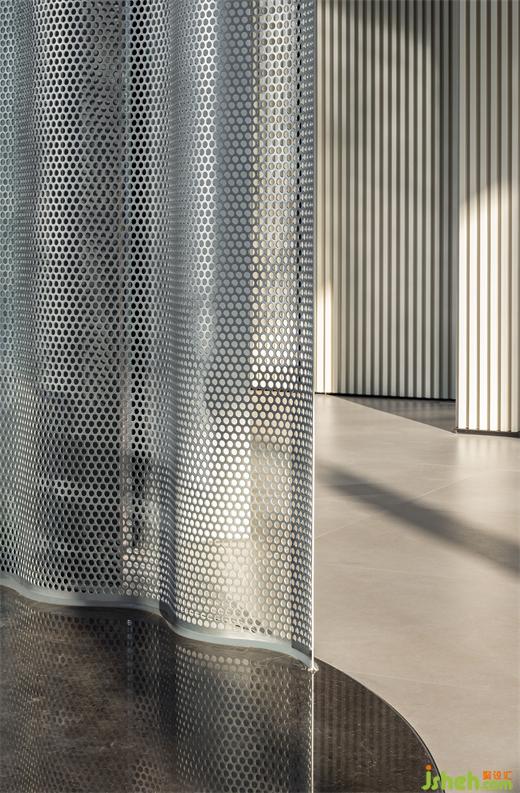 上海展示中心设计遵循建筑由高到低的轮廓转变,顺畅实现沙盘区、洽谈区和水吧区的有序划分。原始建筑的8根立柱被不锈钢包裹,一体向上彰显阵列气势,且以细微的色泽差异与灯带点缀,续写精致细部特征。
