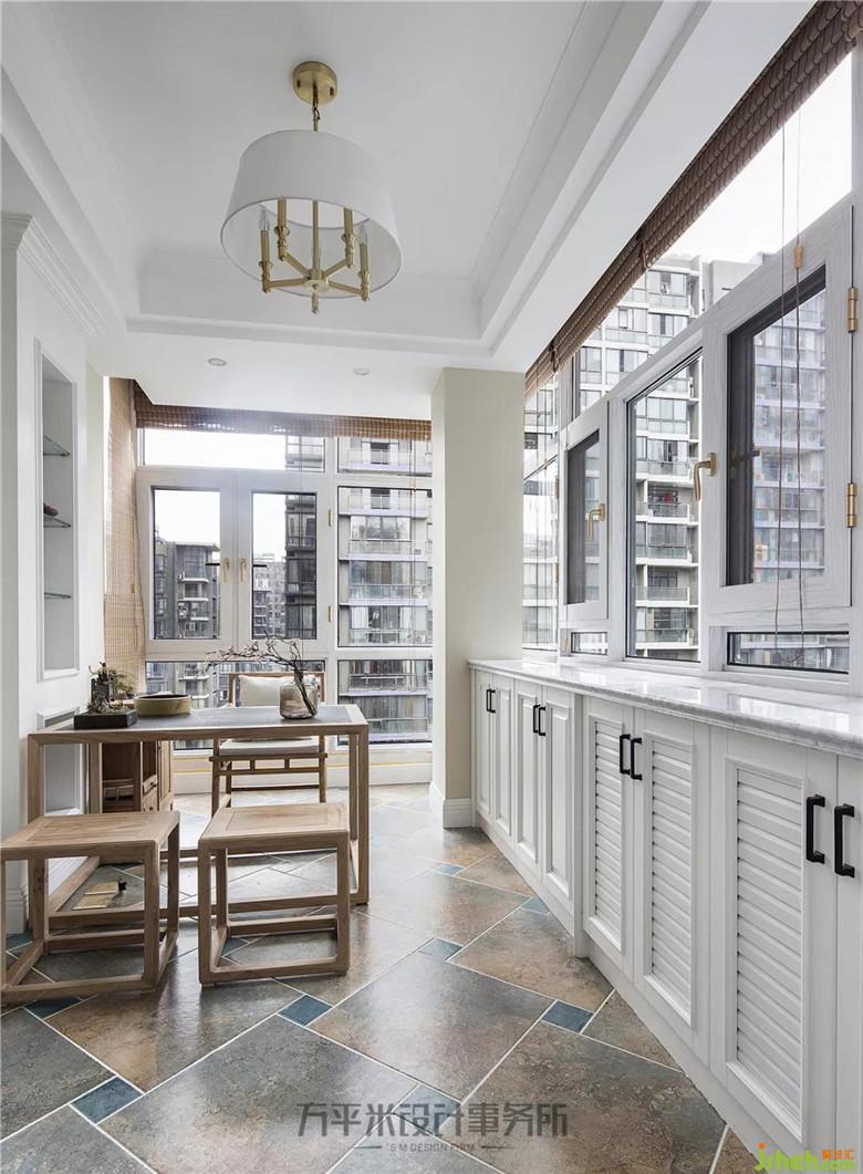 入户花园尺寸宽敞采光良好,作为茶室待客小憩。沿窗台一侧制作储物地柜,柜顶台面采用大理石铺设,便于打理。茶桌一侧制作开放式展示柜,以收纳展示茶具茶叶等,桌下留有下水口,方便使用。