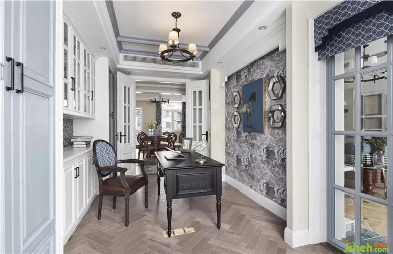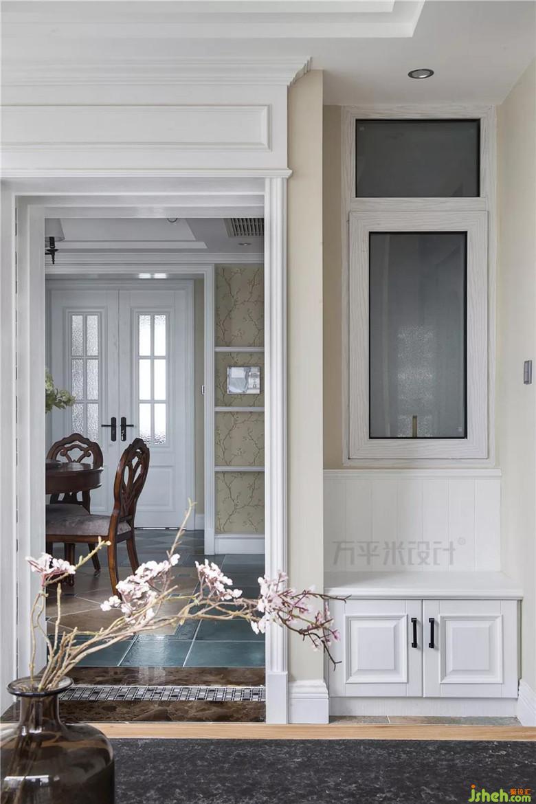原有入户门的承重墙对侧新建对称隔墙,制作美式造型门洞,因地制宜的利用隔墙厚度设计了小小内嵌式储物卡座,方便换鞋及收纳。装修公司