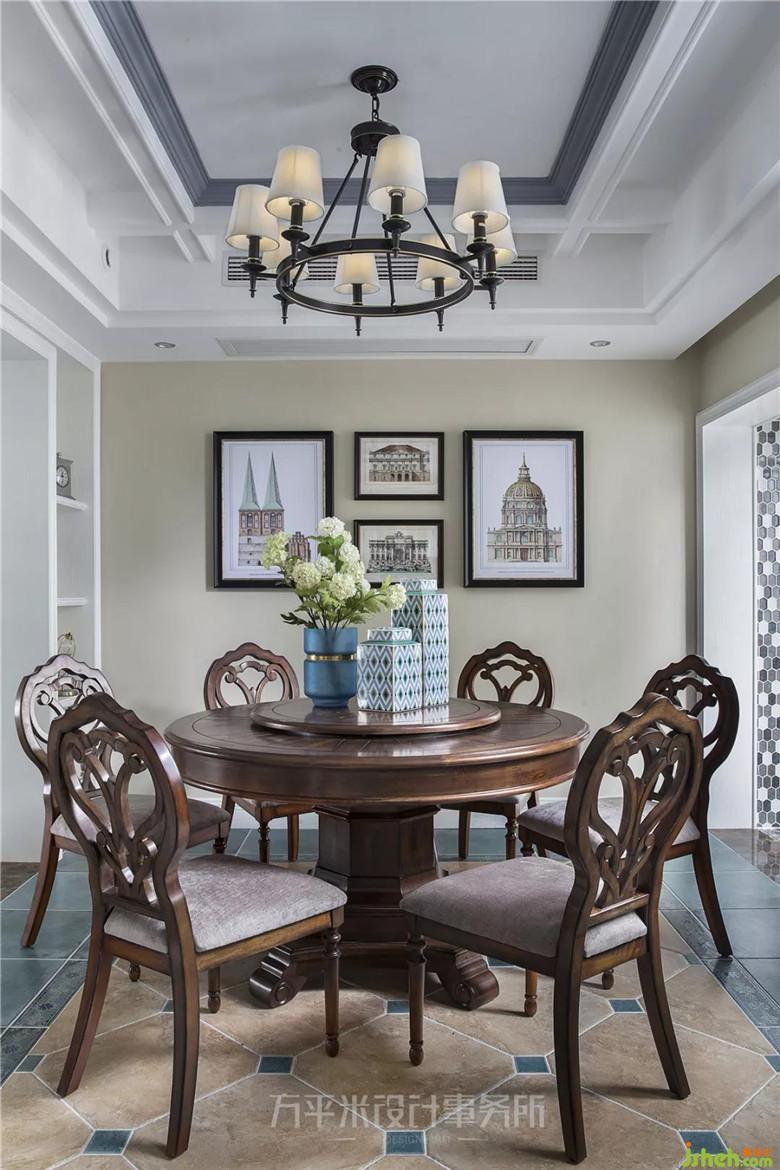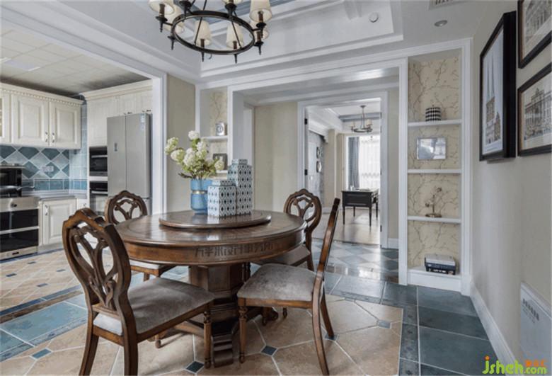 餐厅与厨房间门洞扩大开放式处理,令两个功能区域空间延伸。对称的开放式展示柜则组成了餐厅与过道间的宽敞门洞。
