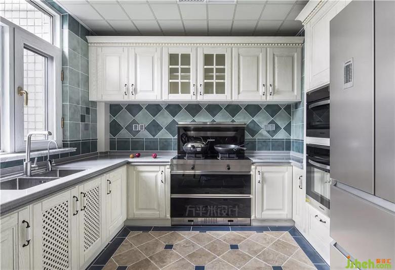 U型橱柜与组合高柜将大尺寸厨电一一嵌入,使操作台面宽敞,洗切炒盛动线合理便利。