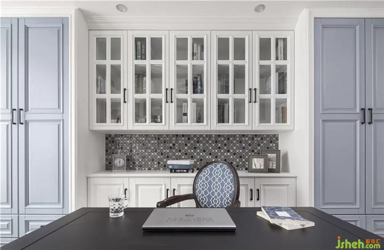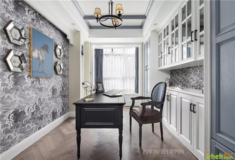 南向景观阳台的部分并入书房内,以一组储物边柜分隔原有空间,制作储物式榻榻米地台,一米五的宽敞地台尺寸令书房也可轻松兼任客卧。纷繁云纹图案装饰端景一侧,如斯变幻。装修公司