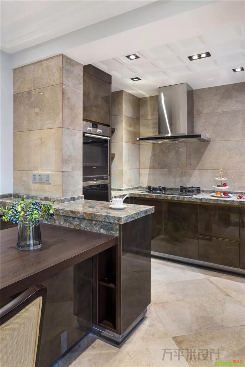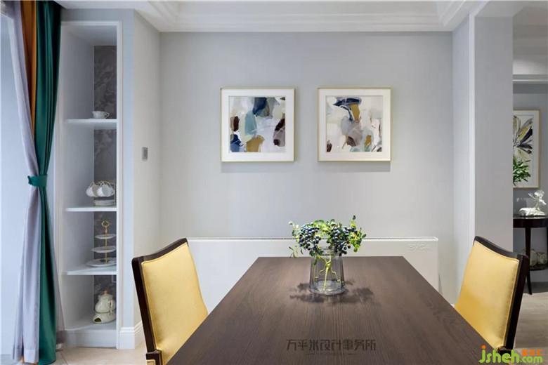 内嵌式开放展示柜为餐厅提供便利收纳,采用灰纹光洁大理石为底,便于打理。