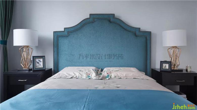 拥有开放式书房的宽敞次卧套间,深邃青蓝色布艺床,及同色系窗帘床品,营造安静与优雅的氛围。