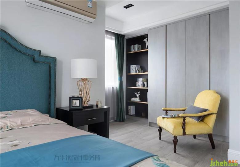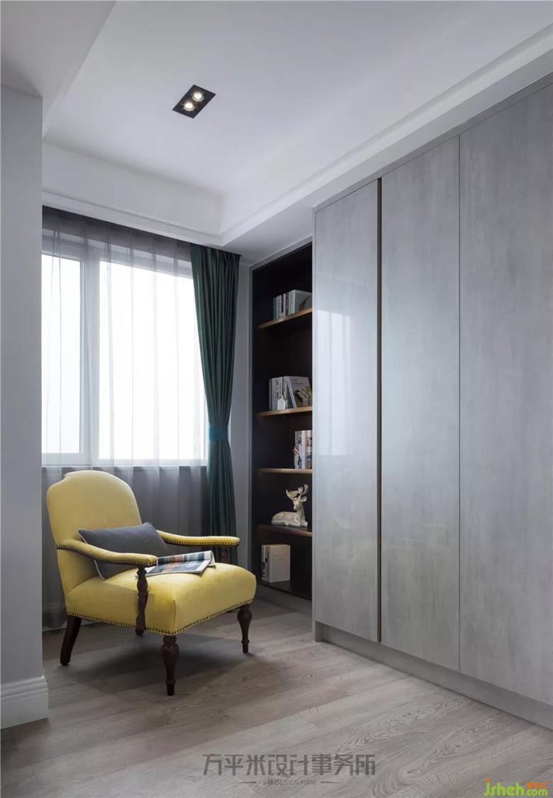 嵌入式满墙衣柜于靠窗一侧,设置开放式书柜,柜内暗藏灯带,提供多种灯光氛围。明亮窗前放置一把舒适单椅,即形成惬意阅读区域。