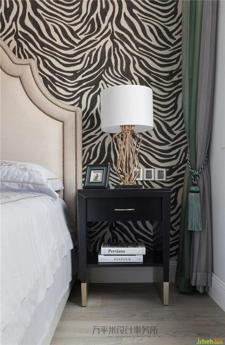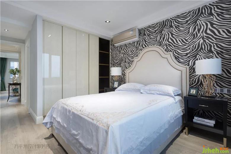 淡雅米色系床及满墙衣柜的纯净色块简洁清爽,相配黑白斑马纹墙面所营造的现代时尚感。