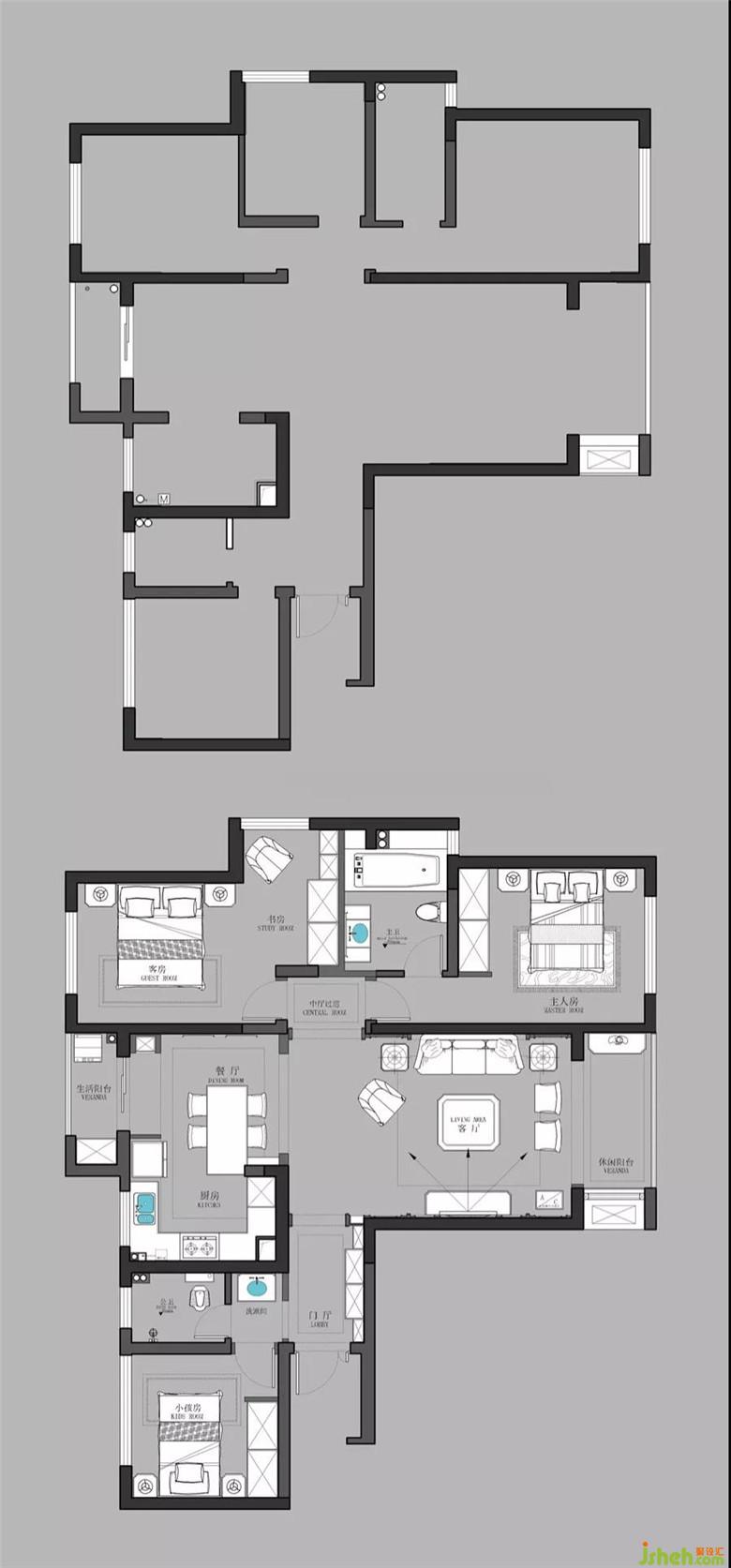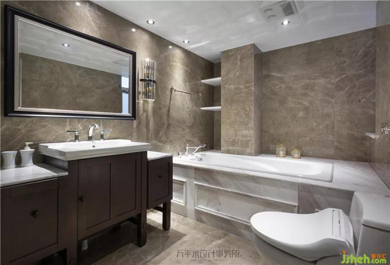 因外推隔墙而变得空间宽敞的主卫,光洁大理石铺贴,并因地制宜利用原承重墙体间隙设置开放式层板置物。高分子板与豆胆灯的结合令美观与实用并存。