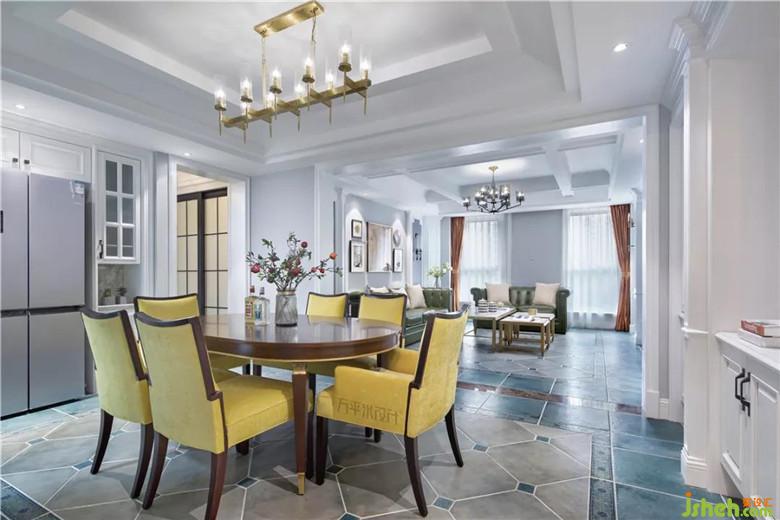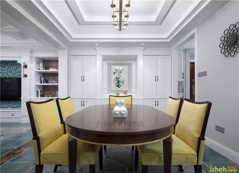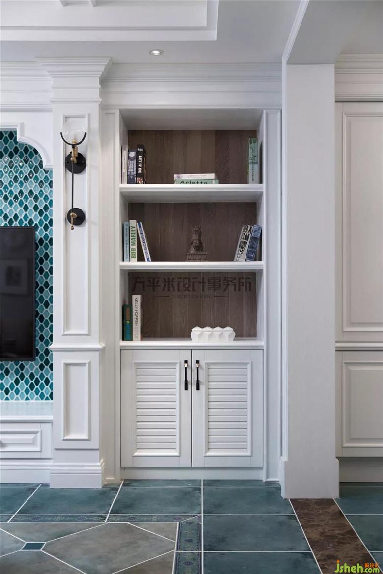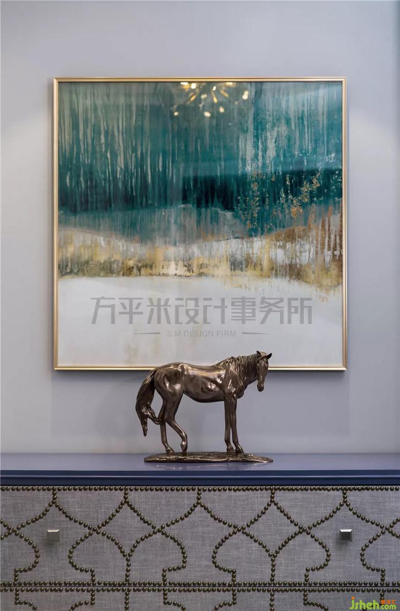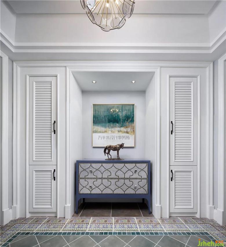 过道一侧的墙面空间,依墙而设的满墙储物柜,考究比例分隔,以富有层次的典雅美式造型将中部留空,保留空间通透。