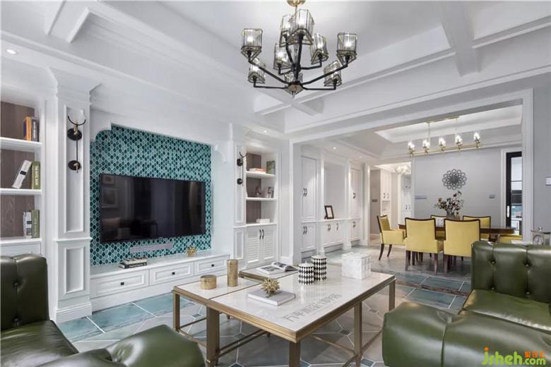 采用翠绿马赛克及浅咖色木地板为底,仿古壁灯内嵌于两侧前端造型立柱,营造浪漫氛围。