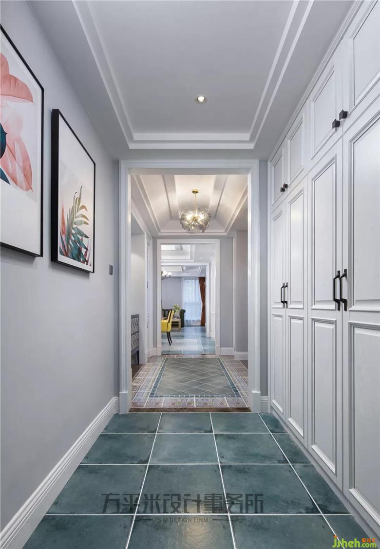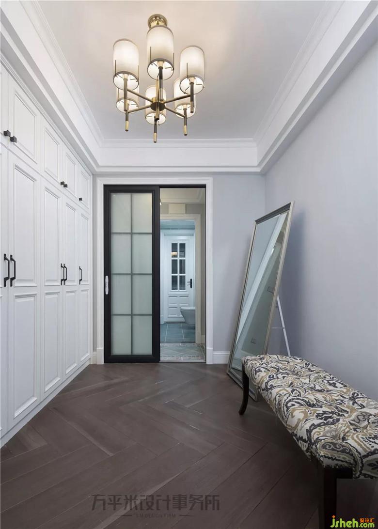 经由拓宽的走廊步入卧室起居区域,依墙而建嵌入式储物柜,将空间利用。并提升入户门厅北向自然采光。