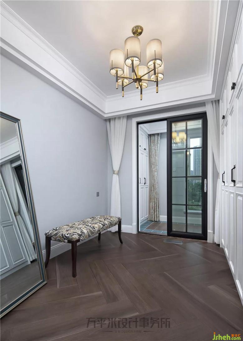 带独立阳台的多功能衣帽间,制作满墙衣柜储物收纳。宽敞内空可充当瑜伽室使用。衣柜对侧墙面预留出开关插座,未来可放置沙发床,使房间充当休闲客卧。