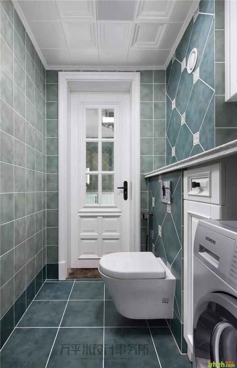 坐便器挂墙安装便于清洁,利用嵌入式水箱形成的墙面厚度,于一侧制作洗衣柜及一体台面。