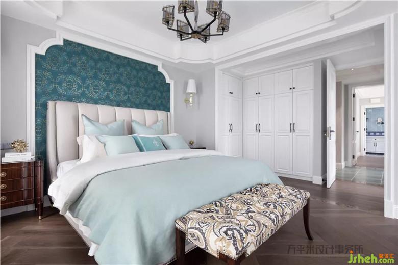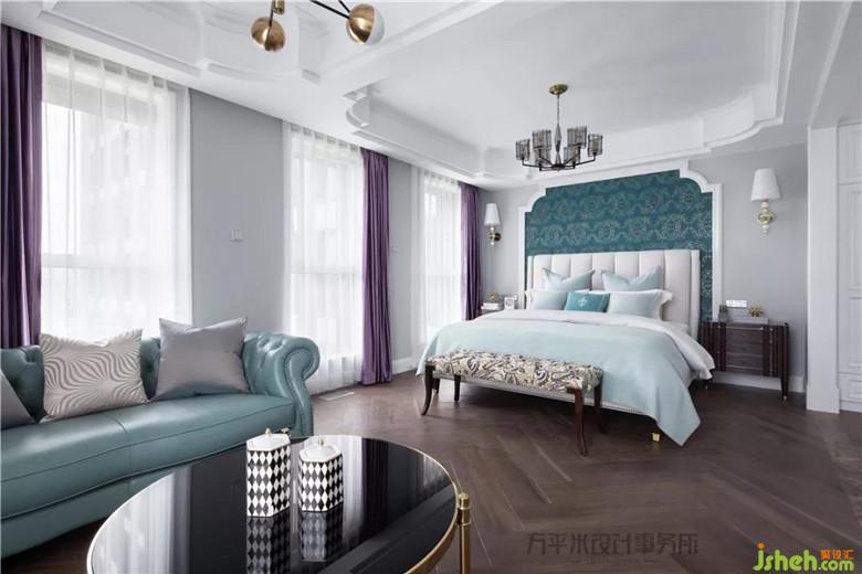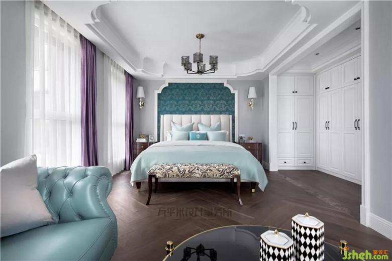 四扇落地采光窗令宽敞主卧明亮通透。L型衣帽间及床尾休闲观影区域的开放式布局令大宅的空间感得以呈现。以顶面分区造型将功能区域划分,并隐藏原梁。
