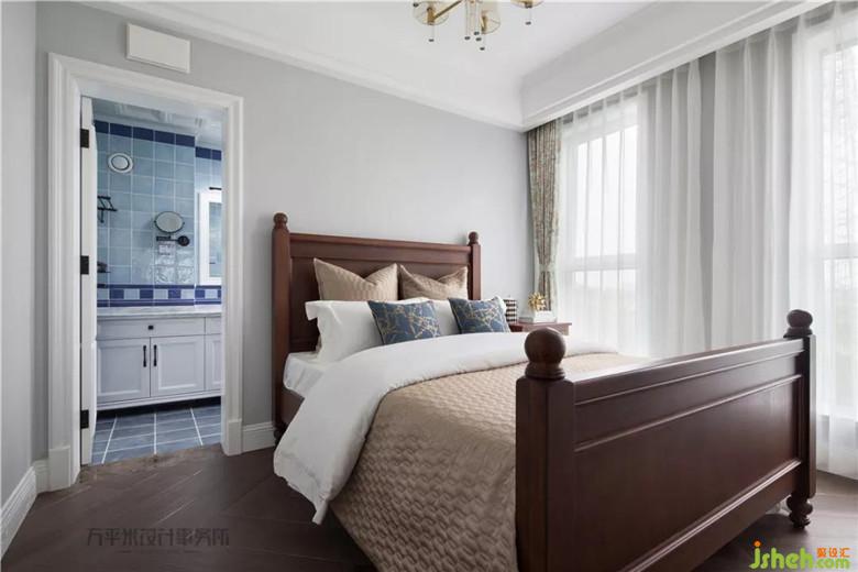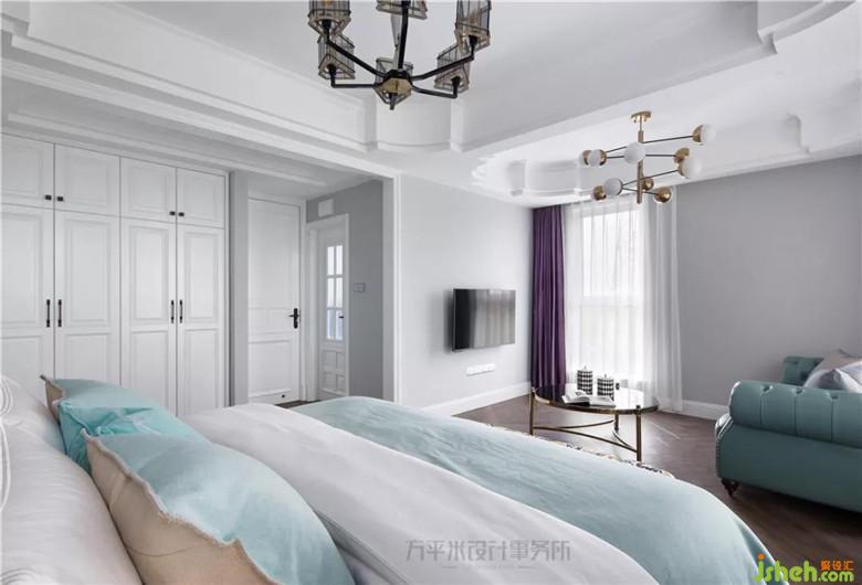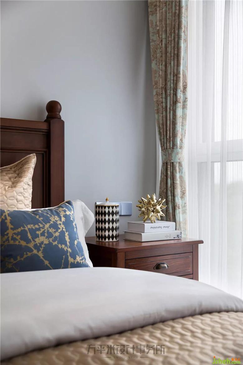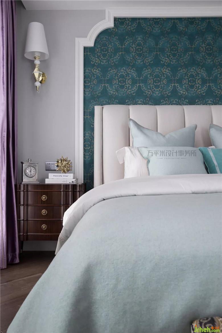 床头背景优雅木作造型勾勒,将美式高背大床轻巧围镶,并呼应于顶面相似弧度。