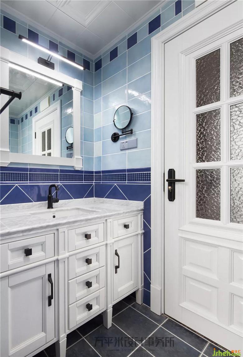 主卫干湿分离,深浅蓝色系仿古砖分色铺贴,定制浴室嵌入式安装。