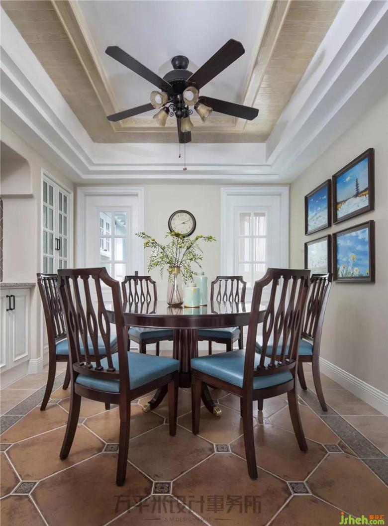 将休闲阳台的门洞位置调整,与厨房门洞一道,于餐厅墙面形成对称的美观立面。墙面装饰画为女主人亲笔所绘,清澄的天空主题传递出对纯净自然的亲近之心。