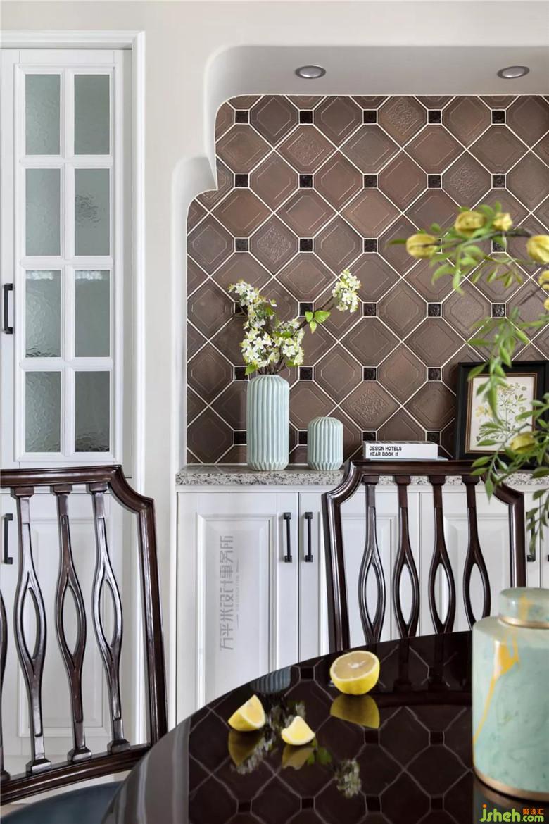 将电表箱隐藏于餐边柜内,获得清爽整洁的立面。与电视墙相同材质及相似造型的使用,于相邻空间内有所呼应。大理石铺设餐边柜台面,便于打理。装修公司