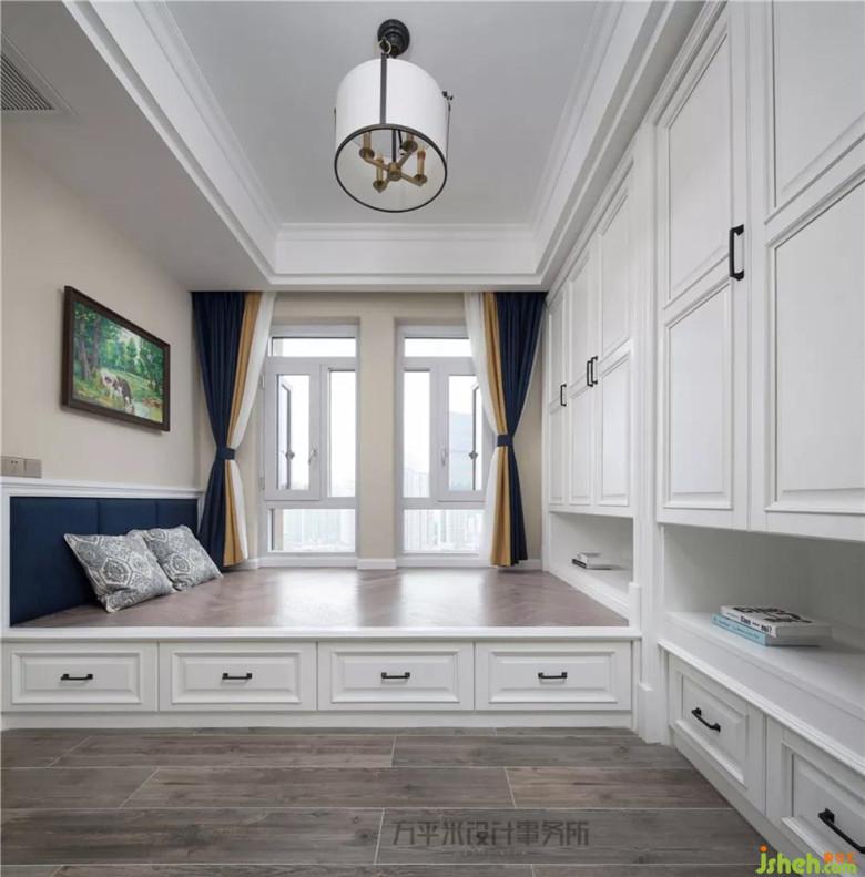 由于业主父母只偶尔过来小住几天,因此将次卧打造成多功能房,平时可作为两个孩子的活动室与琴房。加深的满墙储物柜为全家提供强大收纳。储物式榻榻米地台可坐可卧,铺设床品配合床头舒适软包即可变成双人床,于床头部分更设置便利的双开灯控。森林主题的装饰画仍是出自女主人巧手。装修公司