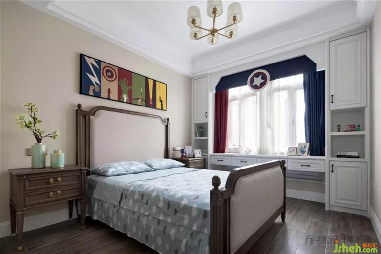 由主卧衣帽间划分出儿童房内衣柜尺寸后,依靠明亮窗台一侧,制作出一体式书柜与宽敞双人书桌。为喜爱超级英雄的小主人,定制主题窗帘并选配对应装饰画。