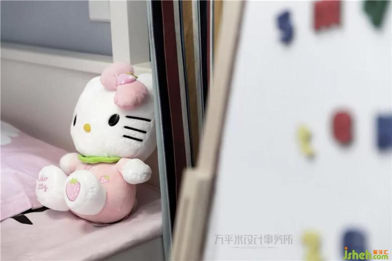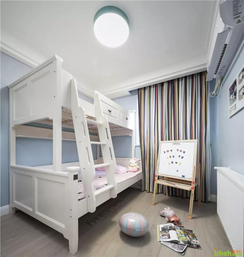 为两个宝宝准备的上下床,隔墙向主卧处平移后,为靠窗一侧预留出放置书桌椅的合理尺寸。次卧为父母的卧室,选用简洁的沉稳木色家具。淡雅装饰画作与全屋主题色彩一致。为节约成本,把以前购置的白色系家具摆放至主卧过渡使用。