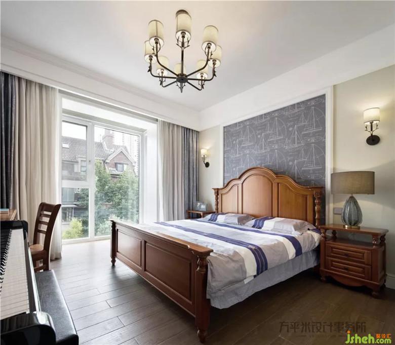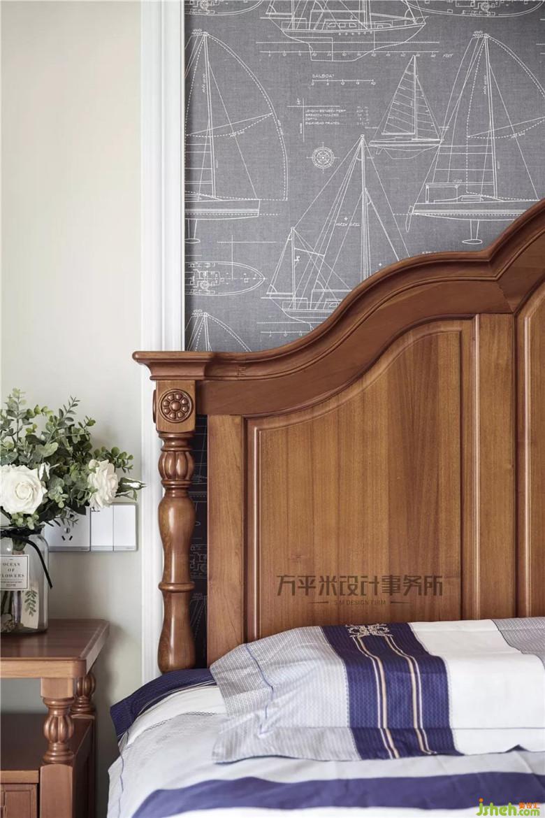 一层南侧卧室为业主大儿子的房间。小露台直接纳入室内成为外推的四面采光窗,提升整体起居光线。精选牛仔布纹帆船主题的墙纸装饰于床头造型,童趣十足并带有男孩子的帅气感。
