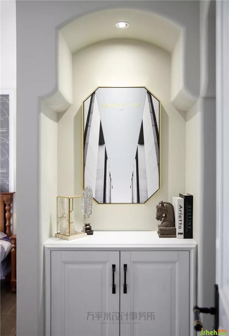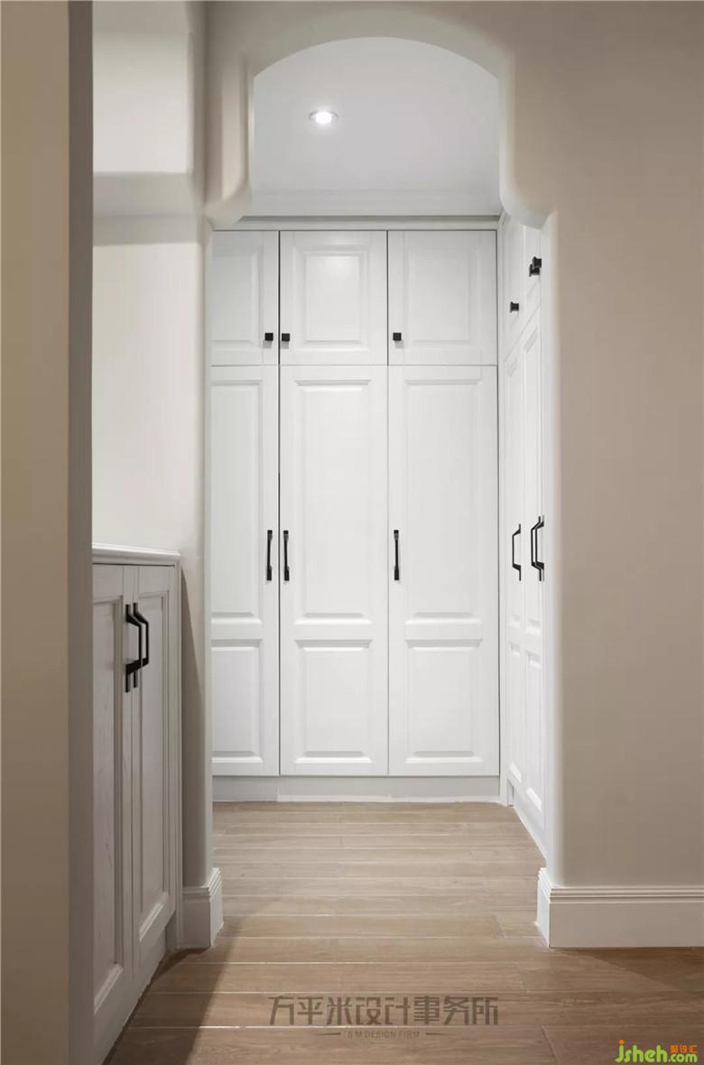 原本卧室内狭长的通道,经调整入口位置将空间合理利用,墙面后推少许,制作小型端景。原本的狭长过道变为L型衣帽间,为卧室提供合理收纳。