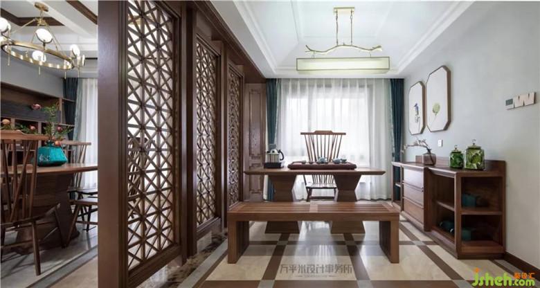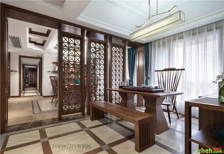 经由门厅进入茶室,将房间原始隔墙取消,以并列的三扇屏风取代,定制的原木镂空屏风两侧均留有通道,环形动线出入无拘。