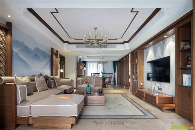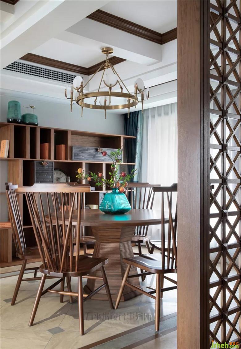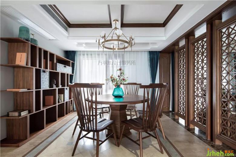 因隔墙拆除,屏风位置后移调整,令餐厅纵向空间变大,可轻松容纳餐边柜尺寸;利用地砖拼花位置,从视觉上横向借用过道面积,并通过对应顶面对称地面调整,平衡空间。木质竹节雕花柜门与淡青竹叶隐花窗帘相得益彰,取青翠沉静色彩平衡大量木质暖色调,取竹之君子品德寓意高雅坚韧。