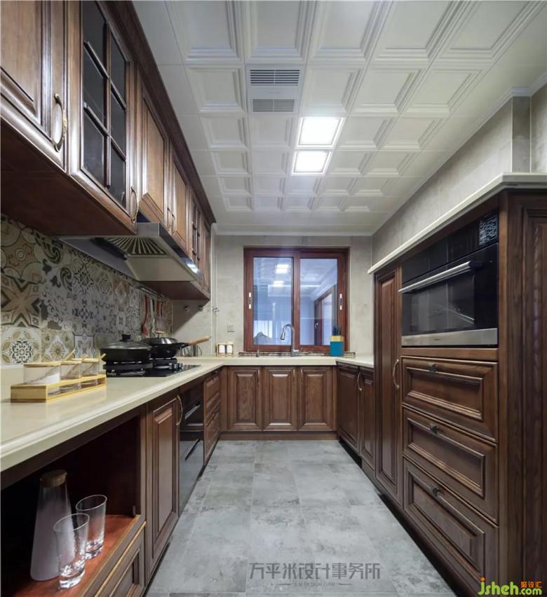 厨房U型橱柜设计以最大利用空间,因中部通道尺寸并不十分宽敞,因此右侧设置半高柜将电器嵌入式安装,顶部留空保留两侧的空间感。