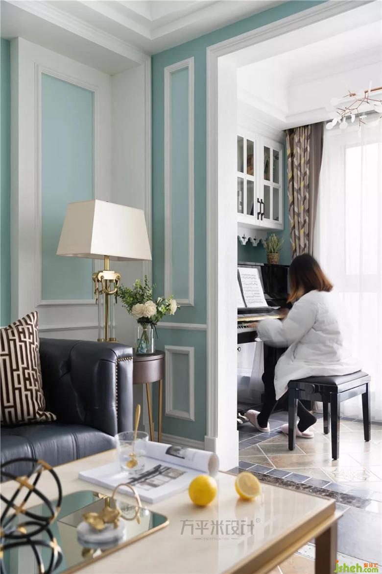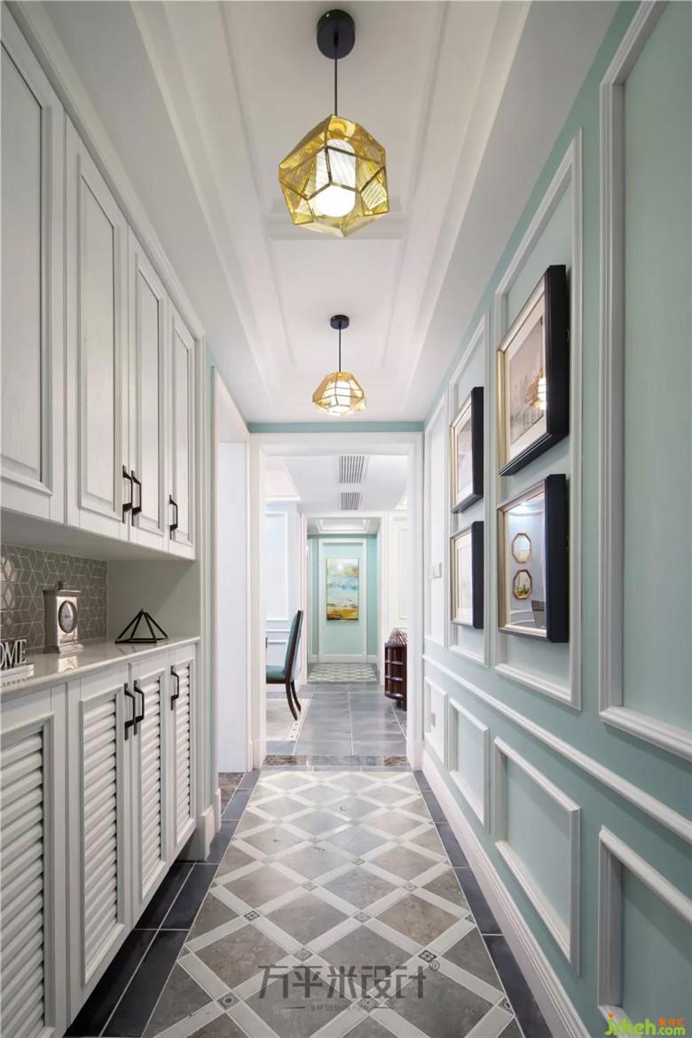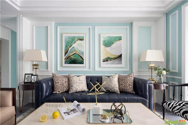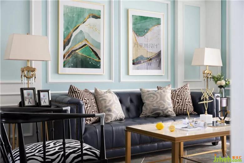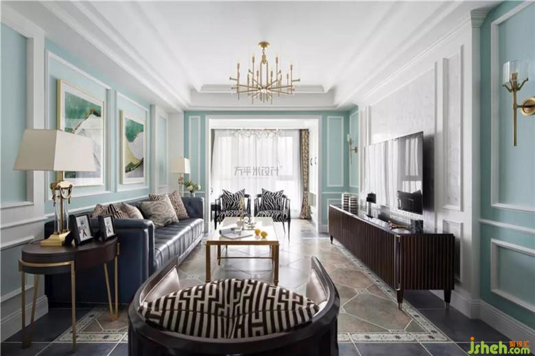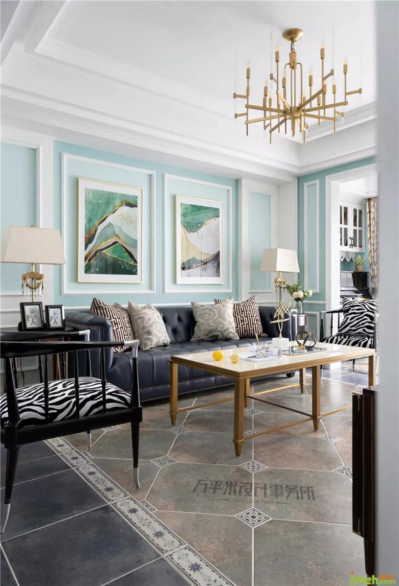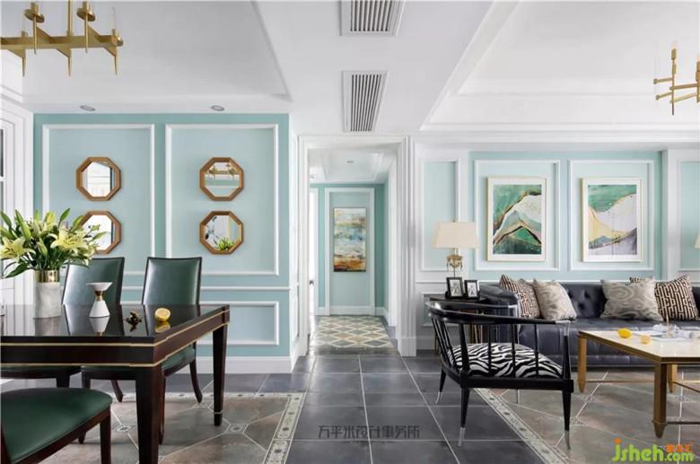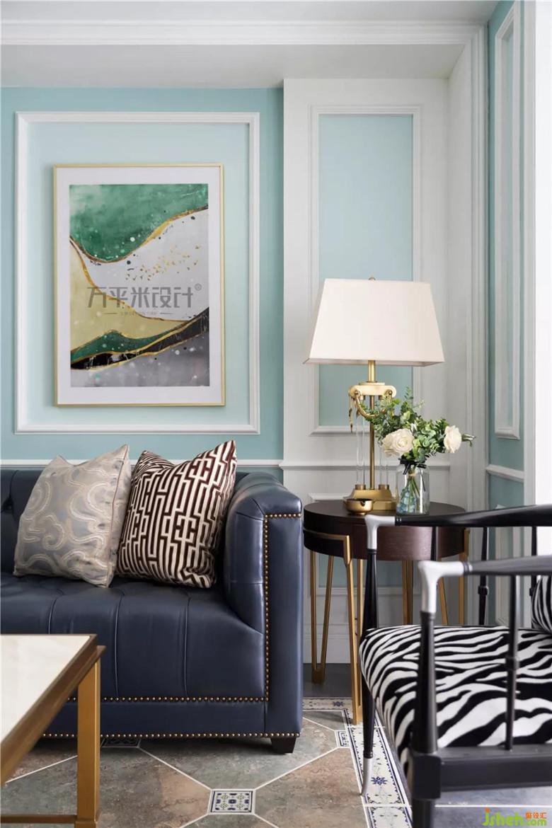轻柔粉蓝与薄荷绿墙面,纯白木制勾勒,深浅渐进将层次划分,如海水微澜,将浅浅波浪轻轻送抵海岸。安静甜美的色彩语言,使归家的心被温柔抚慰,洗去一天忙碌的浮躁。精致黄铜元素,体量轻盈保持空间开阔通透,金属光泽传递特有高级质感。四周深蓝色地砖拼花与家具用色呼应,中心地毯区域大地色系增添温暖感受。深蓝定制沙发,同色系沉稳用色将重心压低。而定制装饰画作恰如其分嵌入线框内。于画面色彩及比例分隔均呼应全屋。