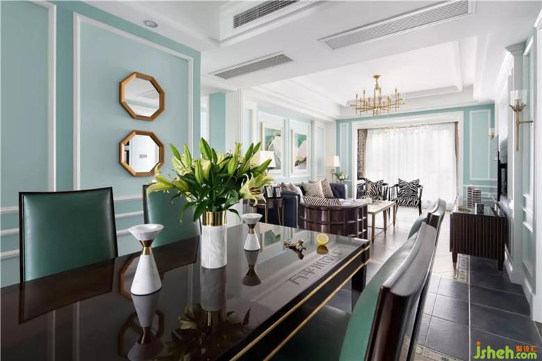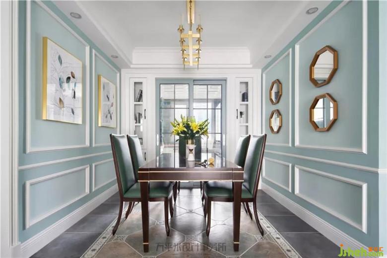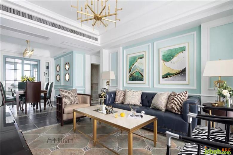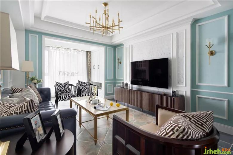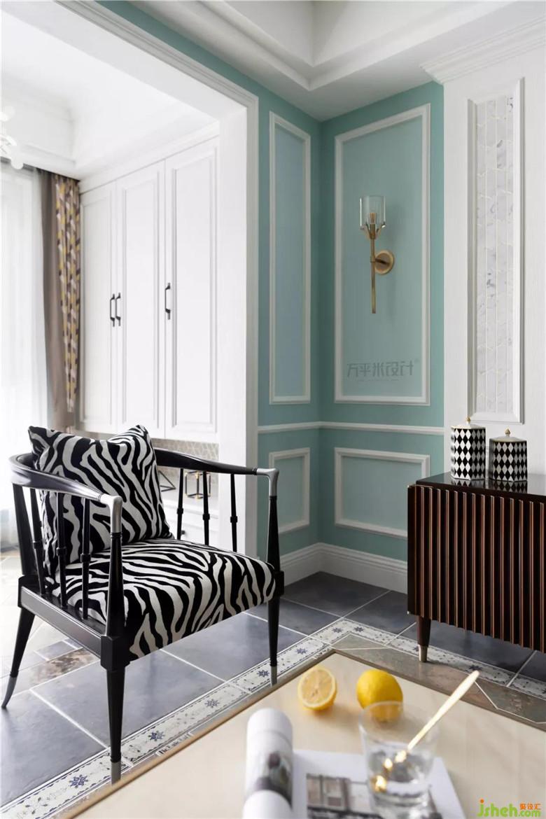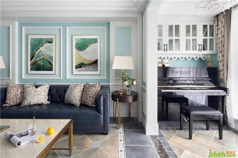 两侧木作造型将沙发主位内嵌式设置,层次分明更具立体质感。家是女主人的名片,她演奏的美妙乐曲,使这张色彩梦幻的名片更添古典魅力。客厅与阳台间的原始隔墙内移后使阳台可放置钢琴。钢琴顶部吊柜增添收纳。定制的灰白大理石马赛克内嵌于美式造型线框内,使大面积浅色观影背景视感舒适亦有格调。