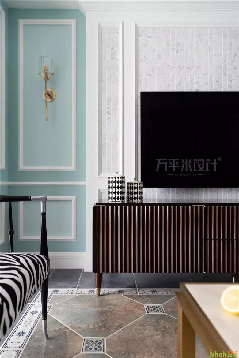 竖条纹电视柜,以独特造型跳出墙面的常规。因阳台开敞式布局使全屋中心区间通风采光均得到提升。