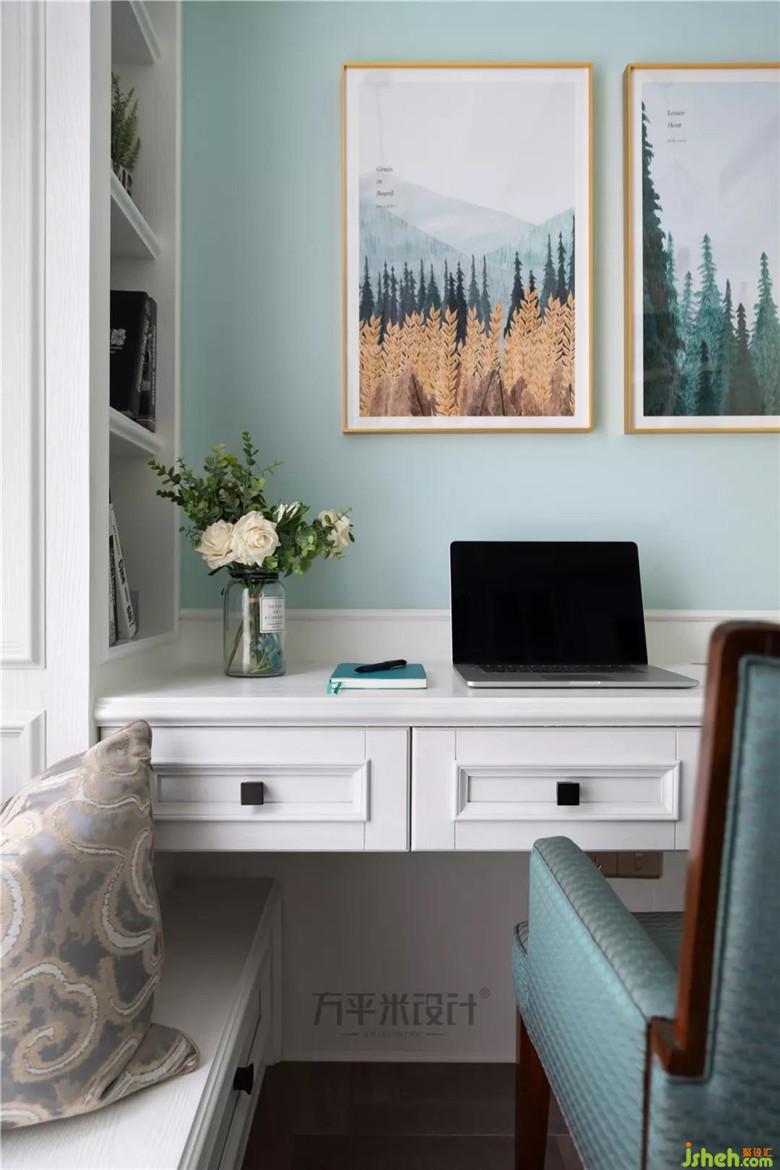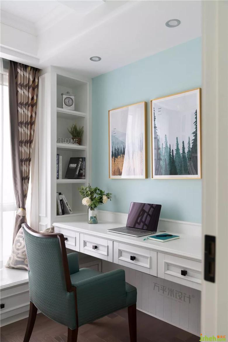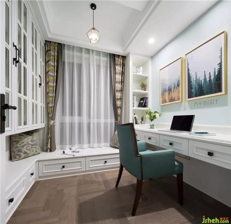 将中庭与空中花园改为更具私密性的独立书房,水纹玻璃房门将自然光线引入走廊区域。房间面积不大,为保证书桌区域的清爽,将开放式书柜设置在书桌两侧。书桌背侧木质挡板,便于清洁。L型一体地台于左侧书柜下方可置物,靠窗一侧则是飘窗形式,可坐可卧。保持空间感的同时又具实用性。