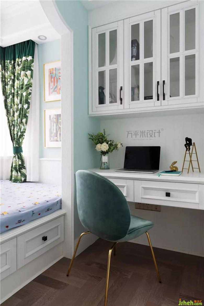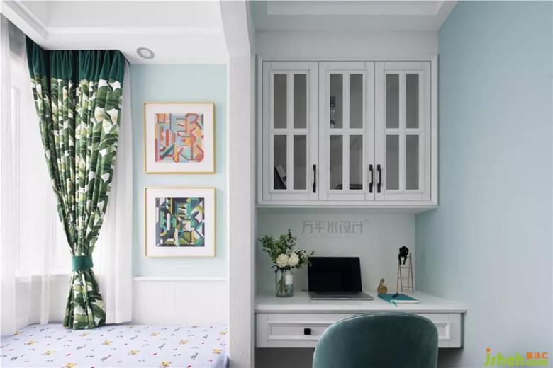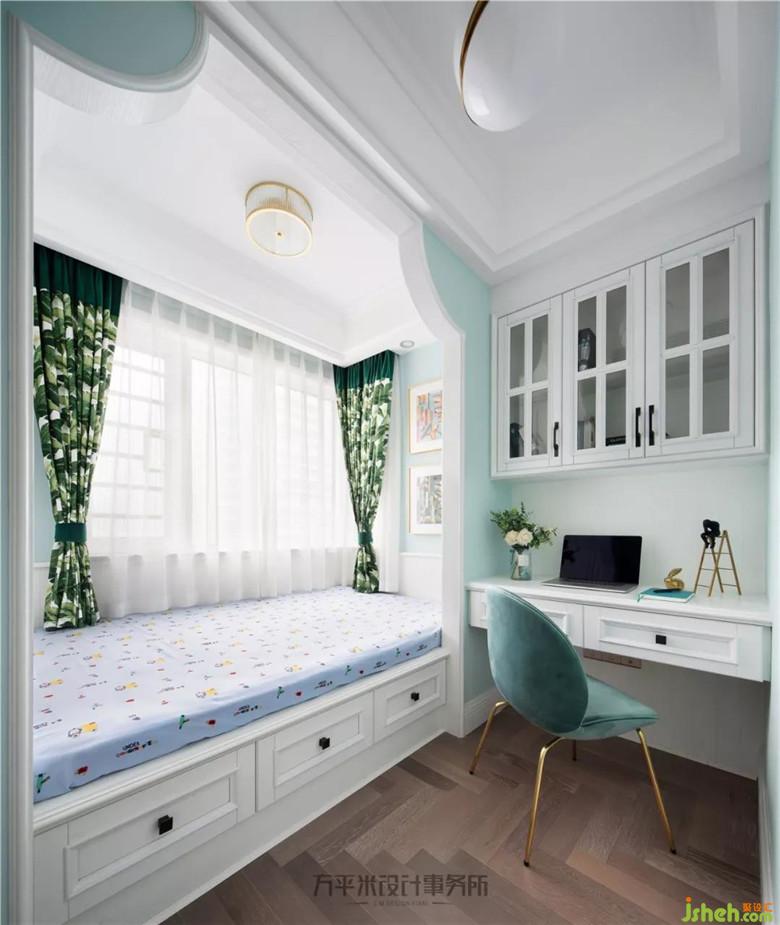 不足六平的儿童房,靠窗一侧是L型采光窗,考虑难以常规放置成品家具,采用储物式榻榻米与定制书桌的形式实现几大功能。床尾一侧为满墙储物柜成为收纳空间。造型隔墙弧形门洞增加童趣,并让床铺区域略微围镶内收。于靠床一侧设置壁灯开关及安全插座。木质护墙板便于打理。窗帘与挂画色彩呼应。