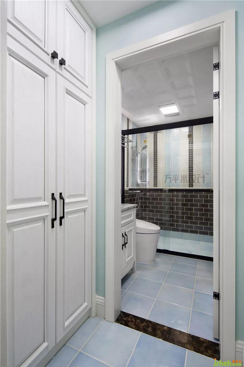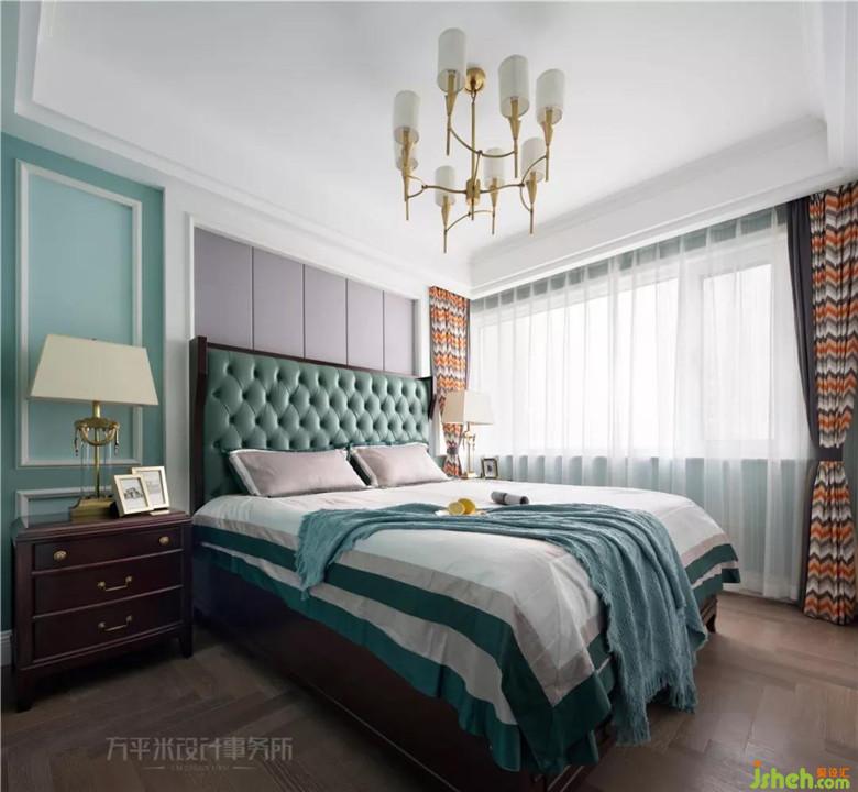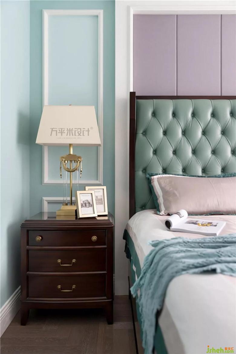 采光明亮的主卧,床头采用灰色布质硬包,内嵌于简洁造型内。将主卫入口后移,借用开放过道位置设置储物柜增加收纳。
