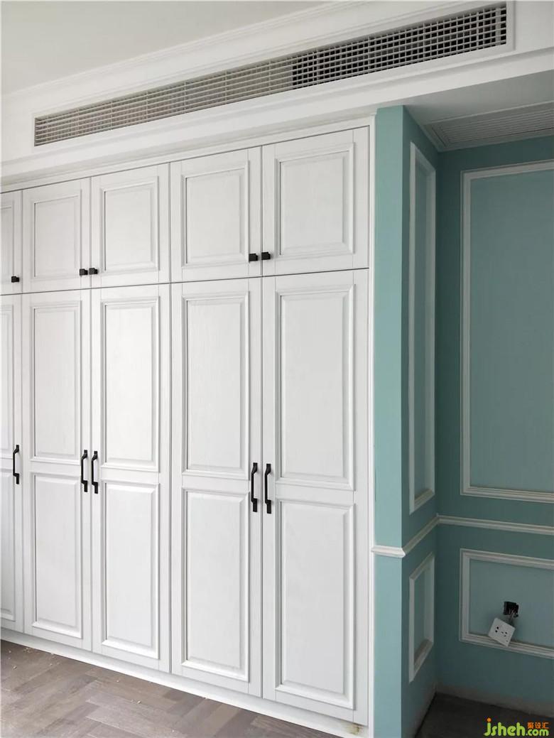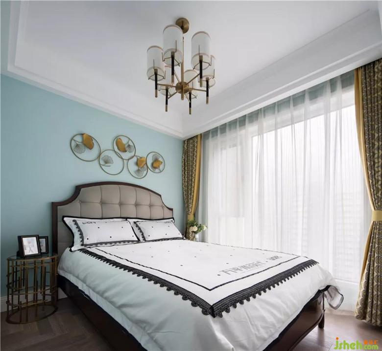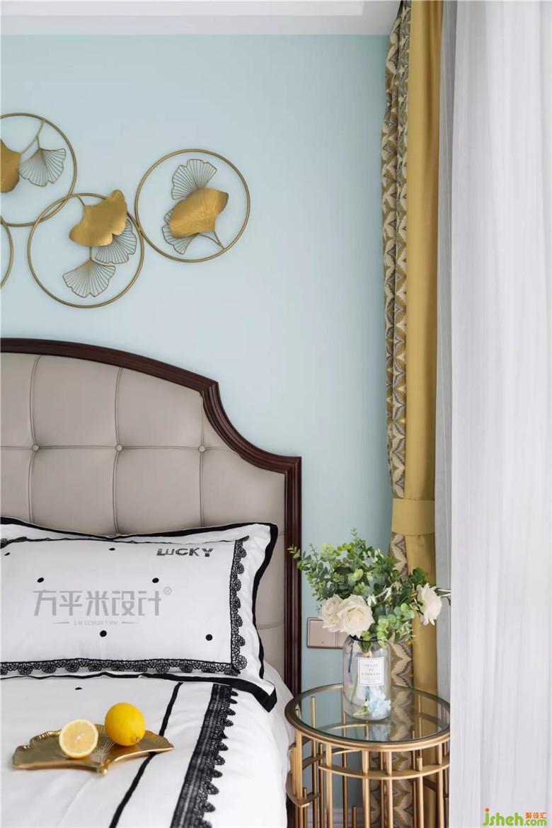 次卧选用温暖姜黄。陈设简单,清爽大方。银杏纯铜壁饰与床头几材质及色彩呼应。主卧衣柜及隔墙。