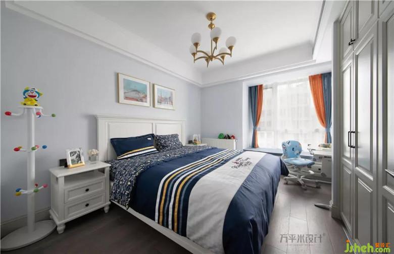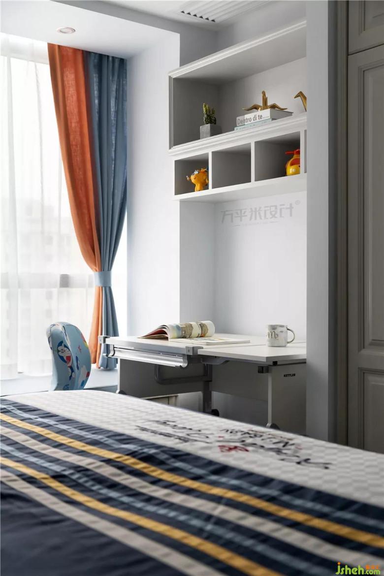 儿童房不同于其他房间,为男孩子选用了更为明快的淡蓝色墙面,利用原有的设备平台外拓,设置出可供小憩的飘窗。为成长中的孩子所使用的活动式升降桌椅预留出位置,并有固定吊柜方便置物。