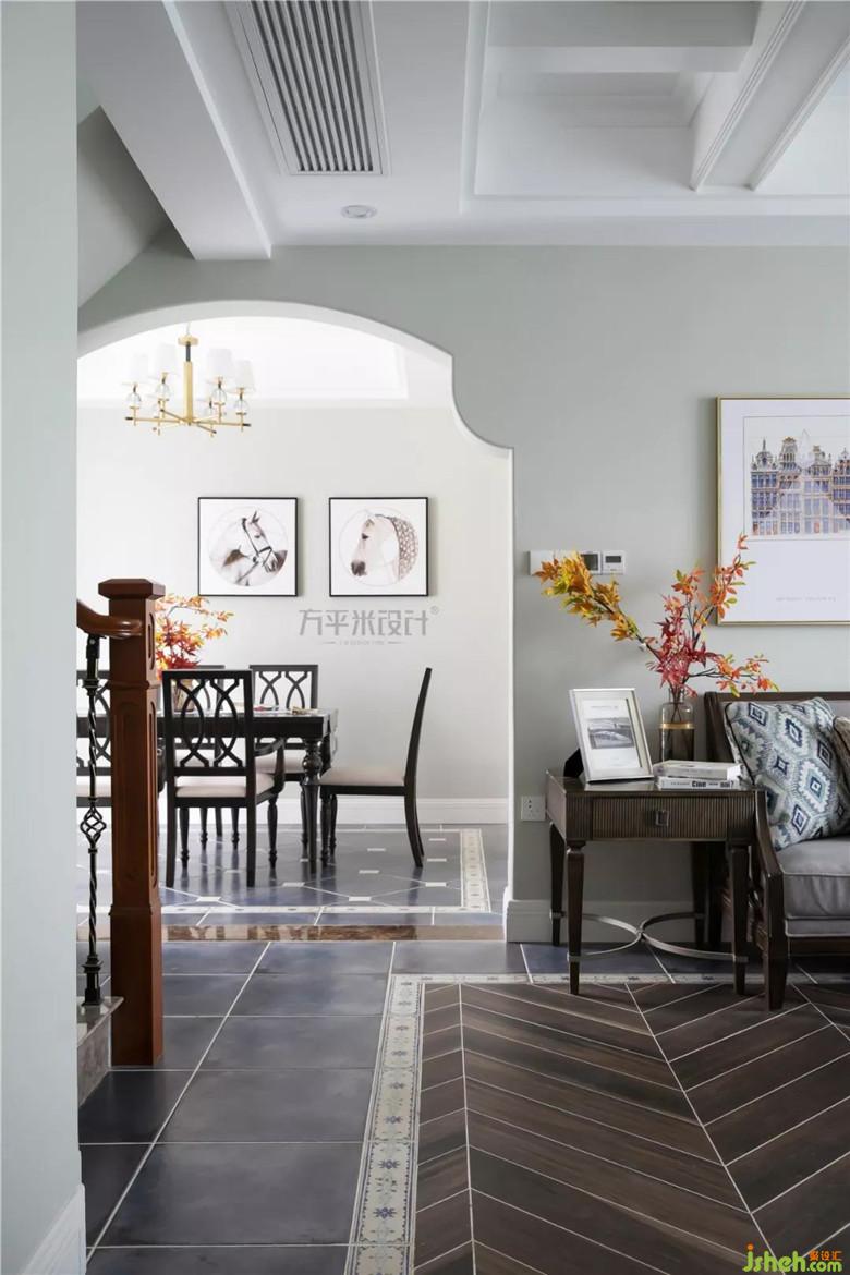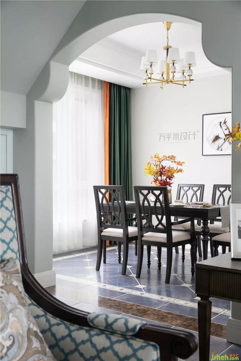 客厅与餐厅之间制作拱形门洞,使客厅与餐厅既独立,又相互关联。同时,也解决了楼梯踏步底部的斜面角度问题。