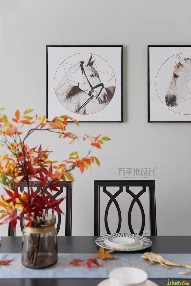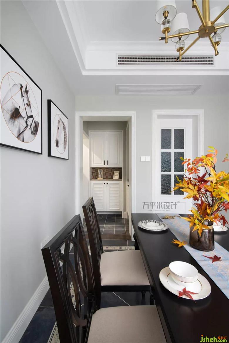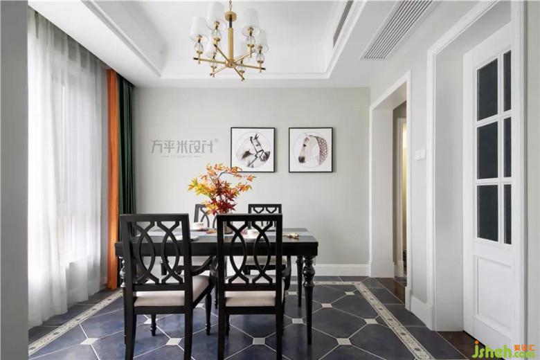 地面采用深蓝色仿古瓷砖铺设,点缀浅色花片,与周围花边波导形成呼应。与顶面吊顶边框遥相呼应,黑色餐桌放置其中,尽显优雅格调。